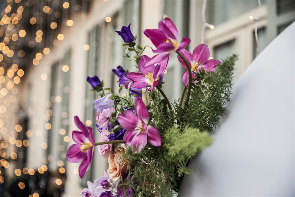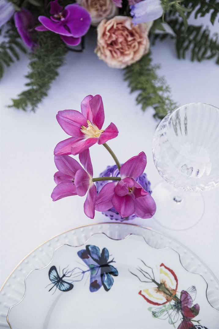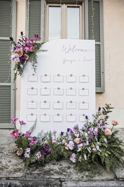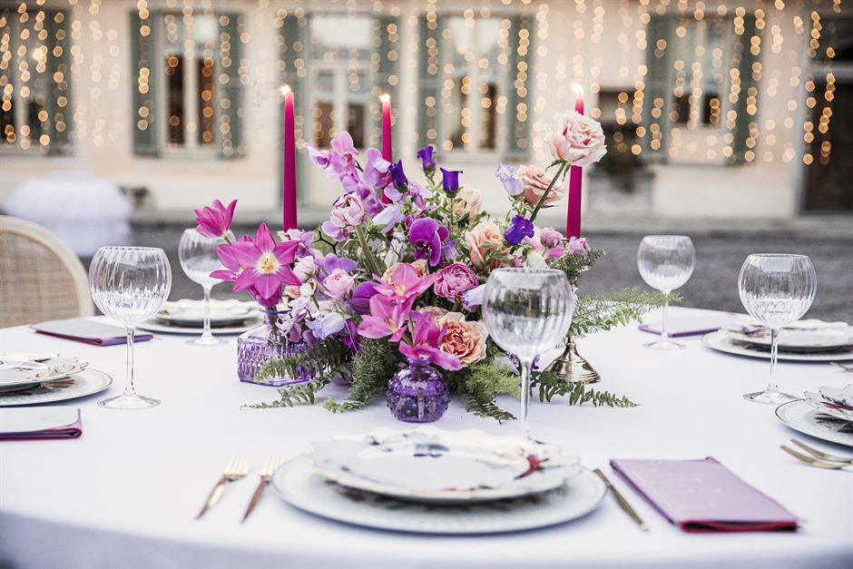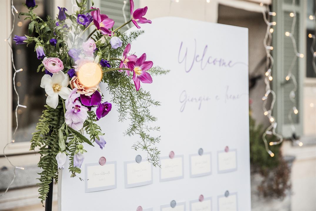 Per un matrimonio glamour, le composizioni floreali sono un elemento centrale. Le tonalità vivaci del rosa, del fucsia e del viola creano un accostamento moderno, in linea con l’estetica sofisticata del tema “Love in Tulle”. Le composizioni scomposte, caratterizzate da una disposizione naturale e non convenzionale, aggiungono un tocco di freschezza e spontaneità all’allestimento, valorizzando la bellezza dei fiori e armonizzandosi con il contesto elegante di Villa Bossi. Questi colori intensi si ritrovano in vari punti del ricevimento, integrandosi perfettamente nella palette generale e nei dettagli decorativi.