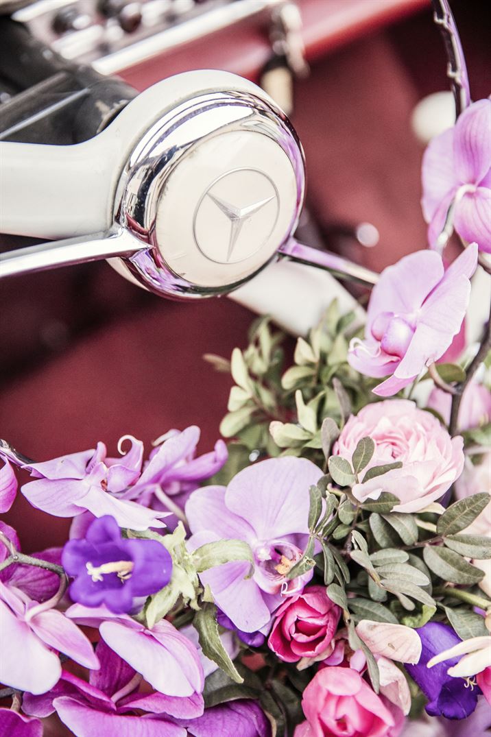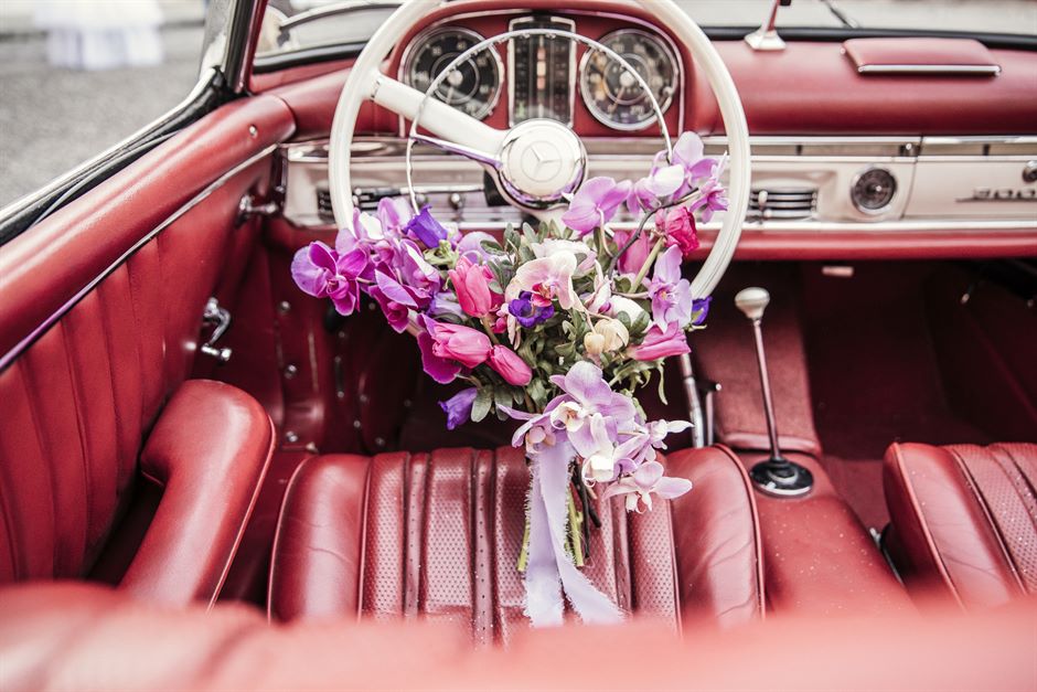 L’auto d’epoca rappresenta un momento d’impatto che crea un contrasto suggestivo con i dettagli moderni del tema, donando al matrimonio un tocco di lusso e romanticismo.