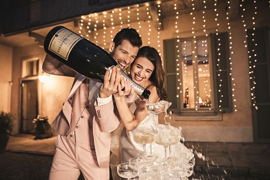 Per un ulteriore elemento glamour, la champagne tower è disposta su un tavolino rivestito di strati di tulle che richiamano l’abito della sposa, un dettaglio che aggiunge raffinatezza e leggerezza all’allestimento.
