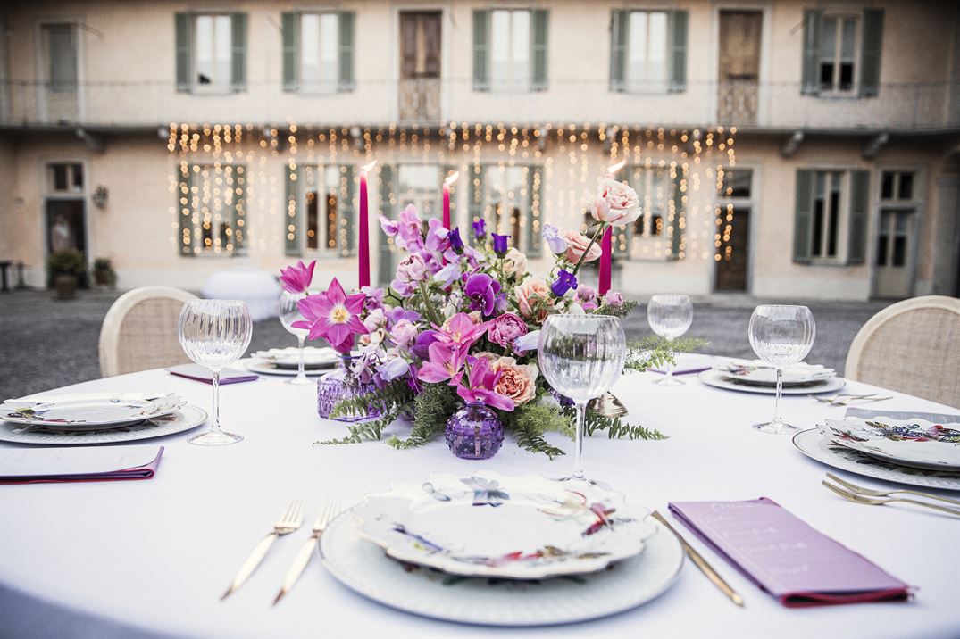 Allestita con tavoli rotondi e decorazioni floreali che riprendono la palette in rosa e viola, la corte rappresenta il cuore dell’evento, unendo l’eleganza storica della villa con un’atmosfera accogliente e intima. Gli ospiti possono così vivere l’esperienza del ricevimento in un contesto esclusivo, arricchito da allestimenti studiati nei minimi dettagli.in Tulle”.