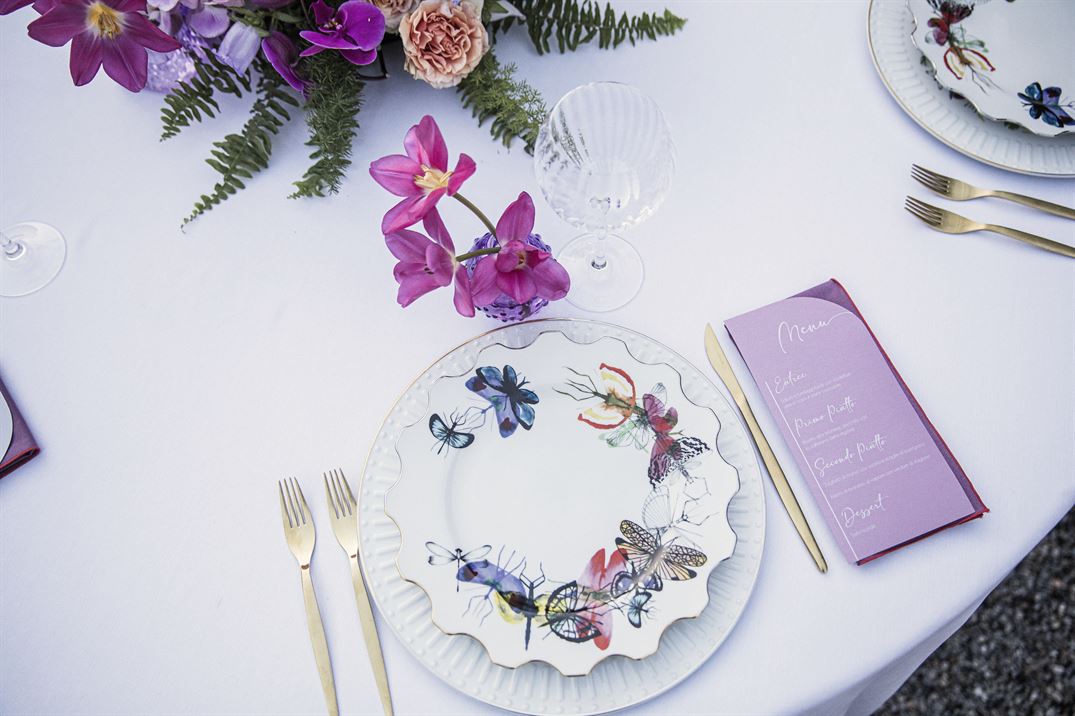 La scelta dei piatti decorati con motivi a farfalla e dalle forme diverse aggiunge un dettaglio unico alla tavola, mentre i menù colorati, posati sui tovaglioli, richiamano la palette del matrimonio con un tocco di originalità.
