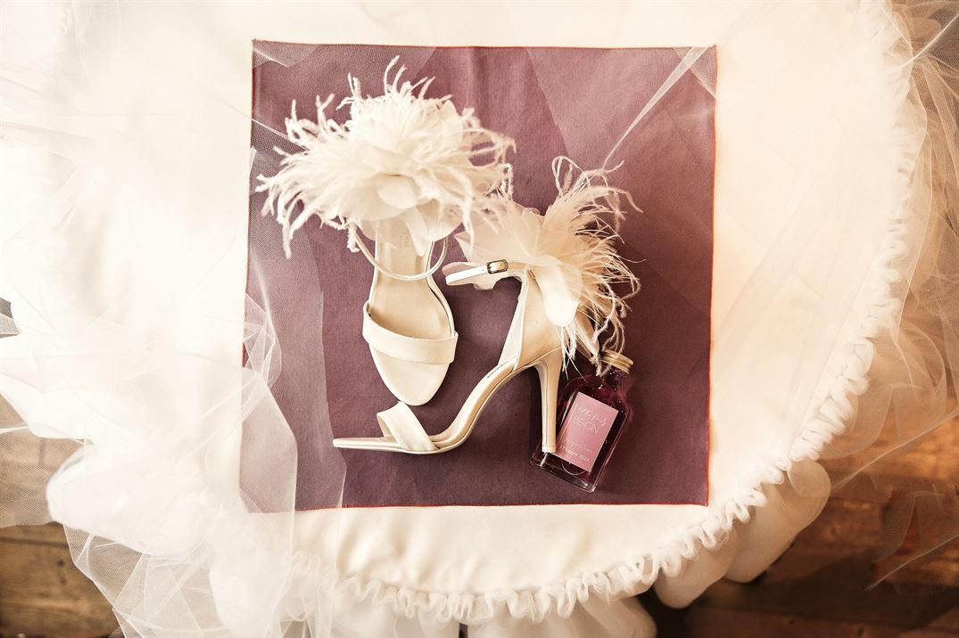 Per un look sofisticato e in linea con il tema, la sposa può optare per sandali con piume, un accessorio che aggiunge un tocco di leggerezza e modernità, richiamando l’estetica del tulle e aggiungendo un tocco chic all’abito nuziale.